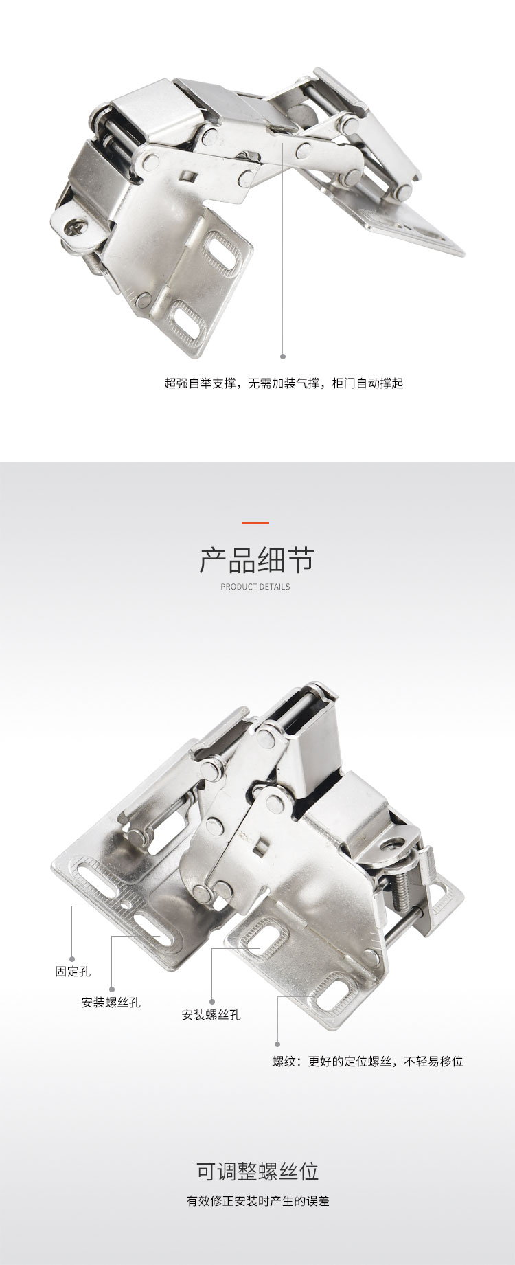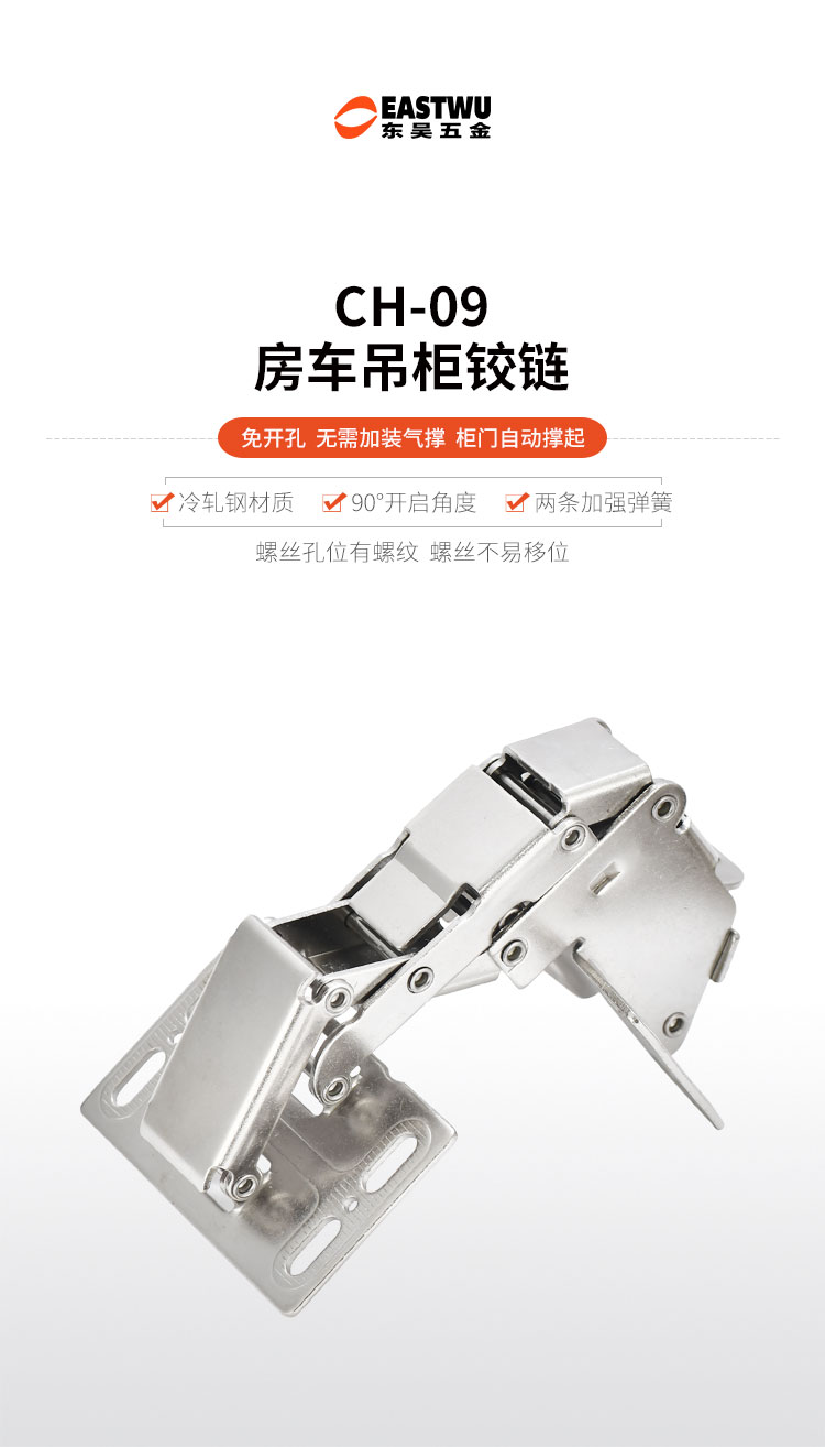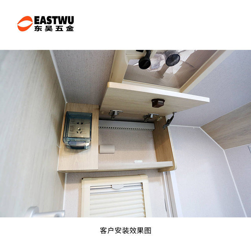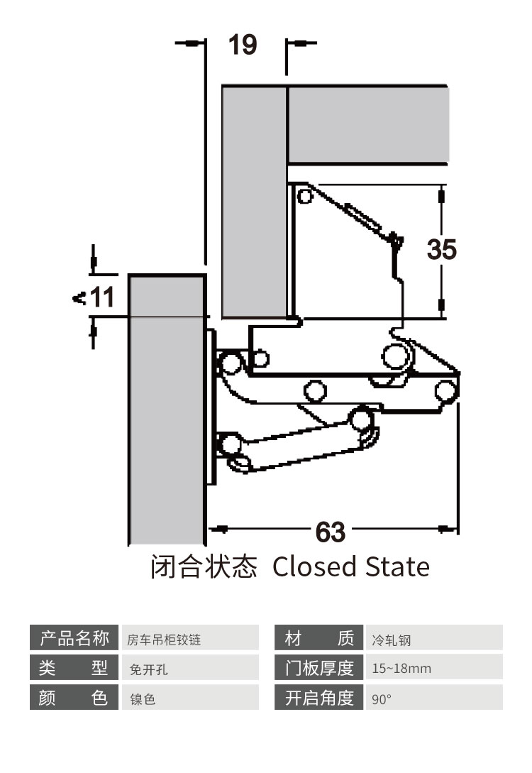 冷轧钢房车吊柜铰链 免开孔 无需加装气撑 柜门自动撑起 适用门厚15-18mm 开启角度90° 使用范围房车吊柜、衣柜等