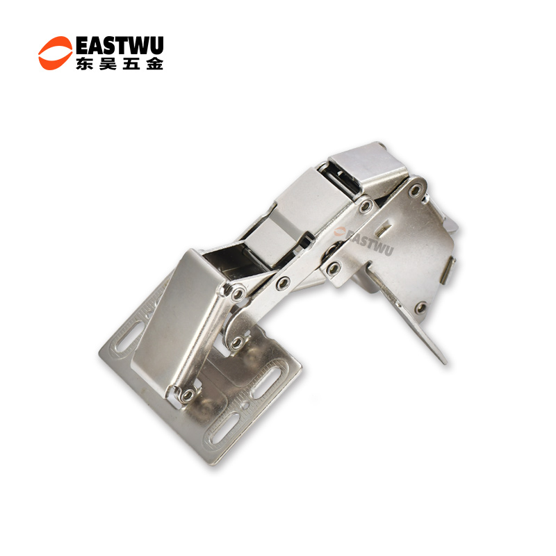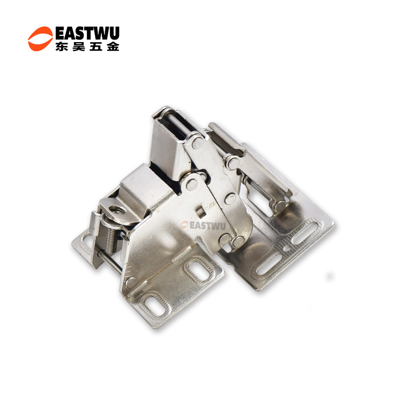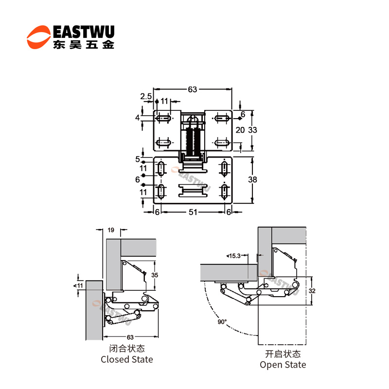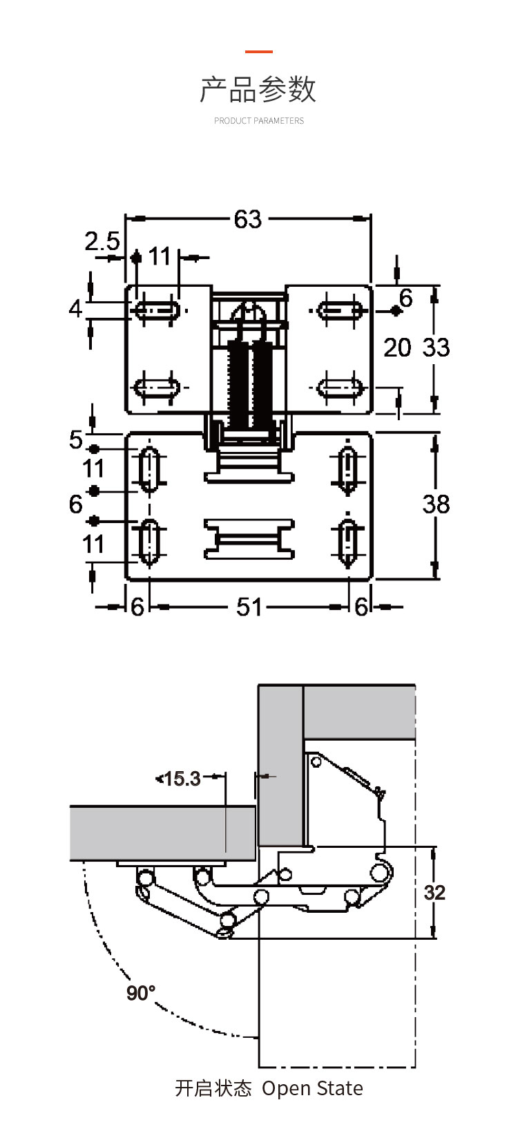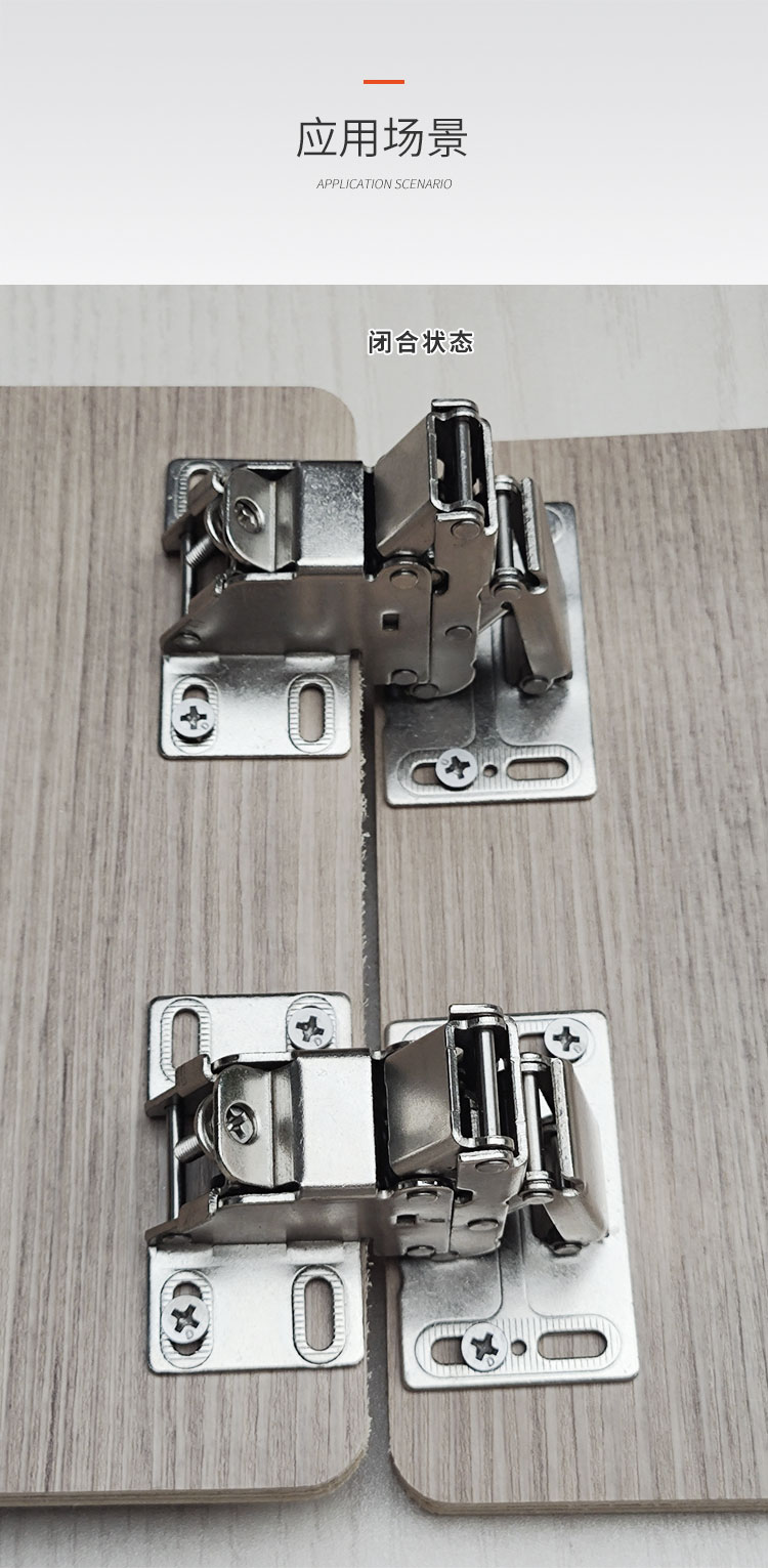 冷轧钢房车吊柜铰链 免开孔 无需加装气撑 柜门自动撑起 适用门厚15-18mm 开启角度90° 使用范围房车吊柜、衣柜等