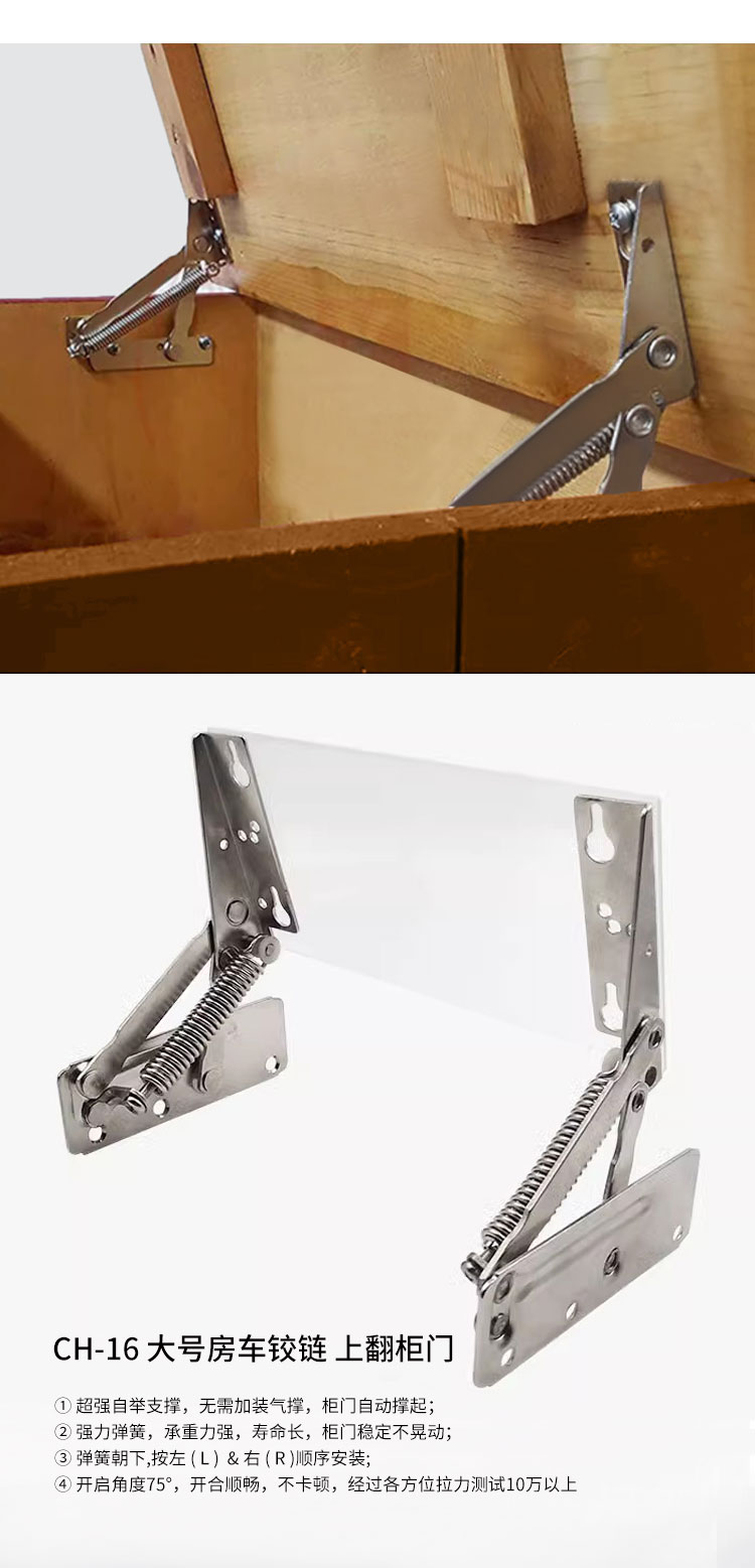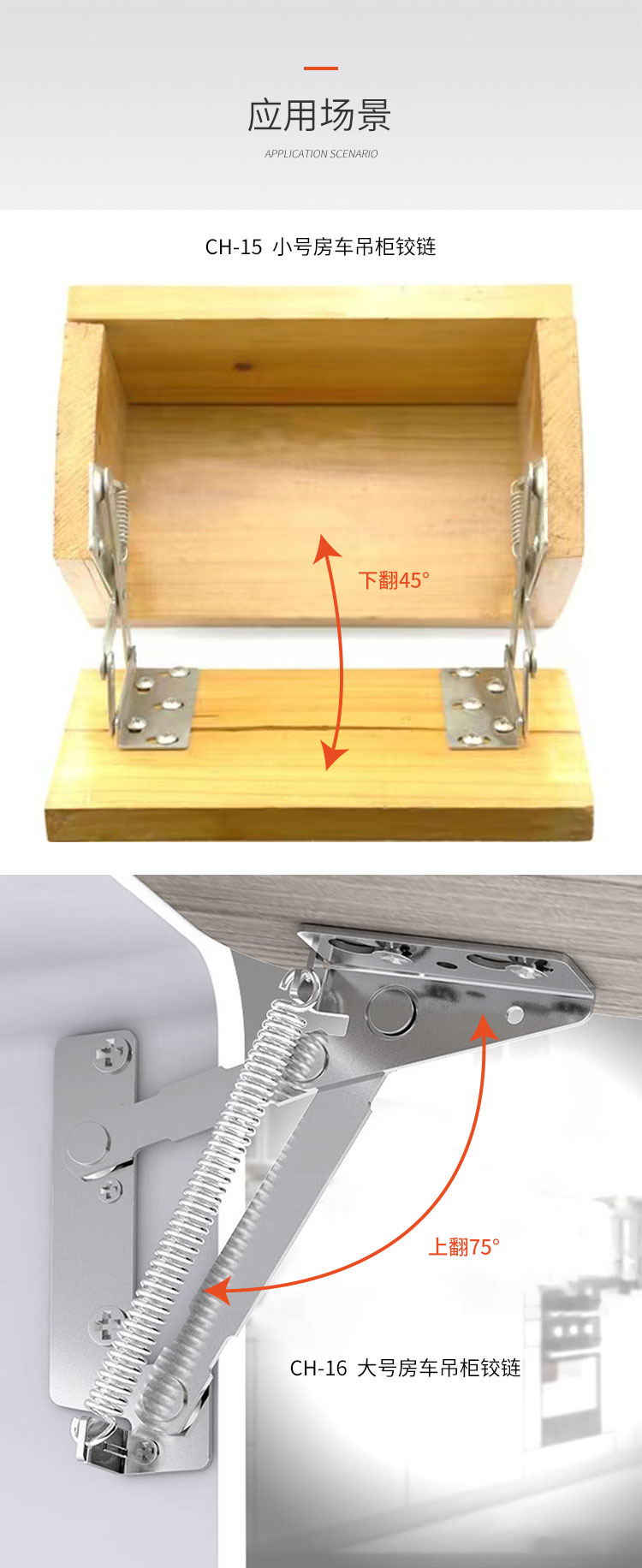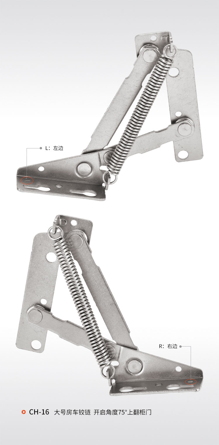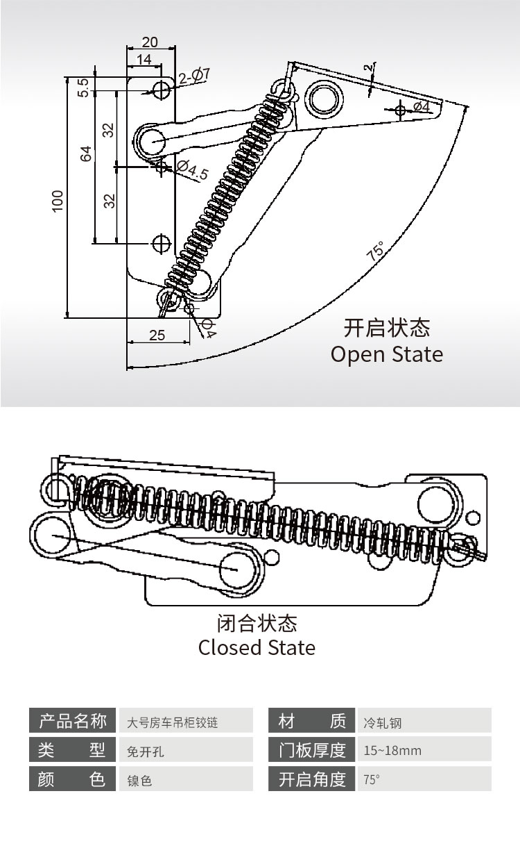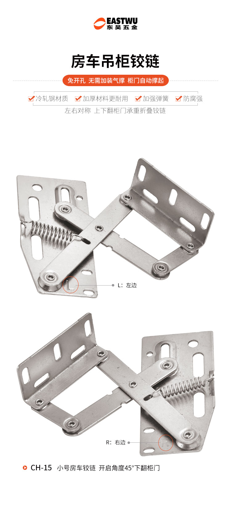 冷轧钢房车吊柜铰链 免开孔 无需加装气撑 柜门自动撑起 适用门厚15-18mm 开启角度75° 使用范围房车吊柜、衣柜等