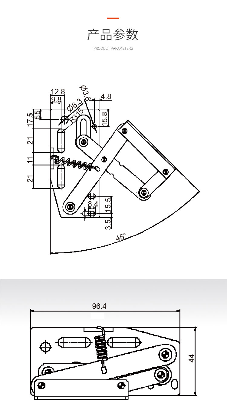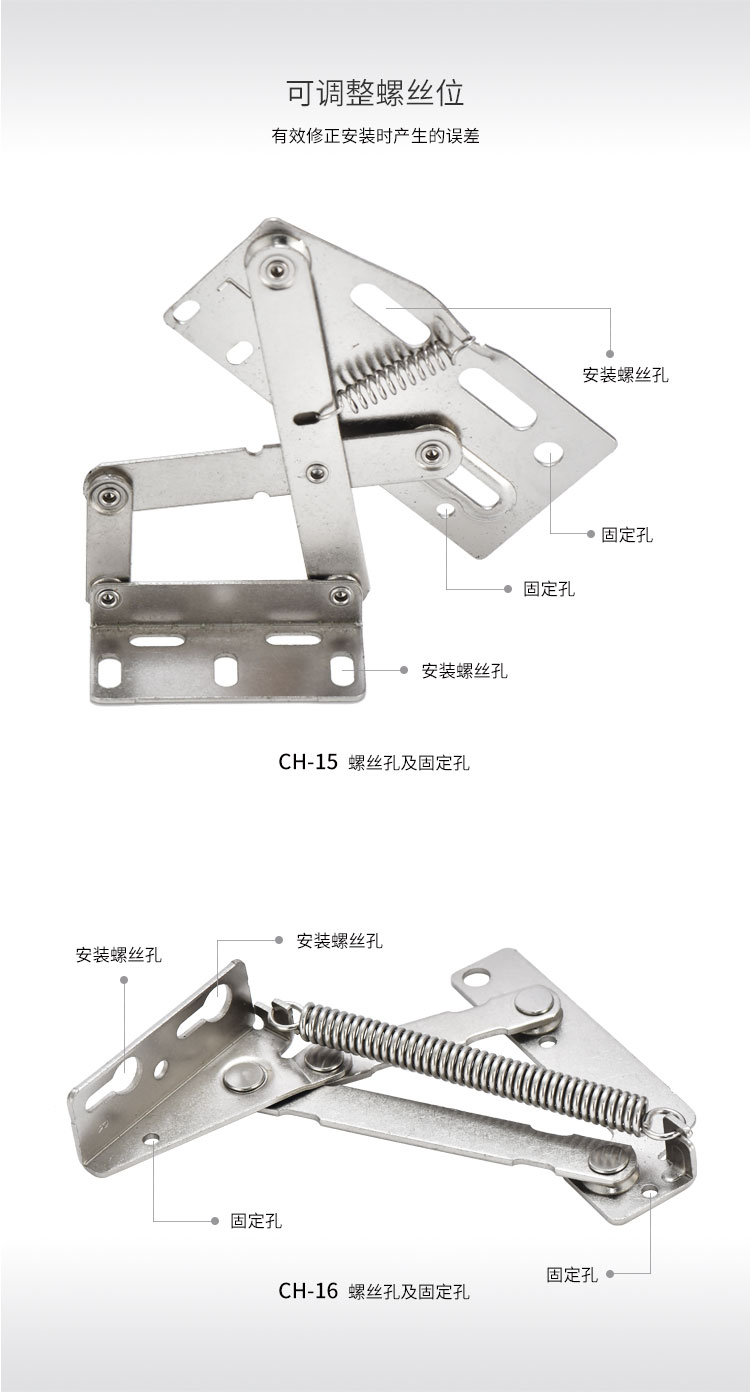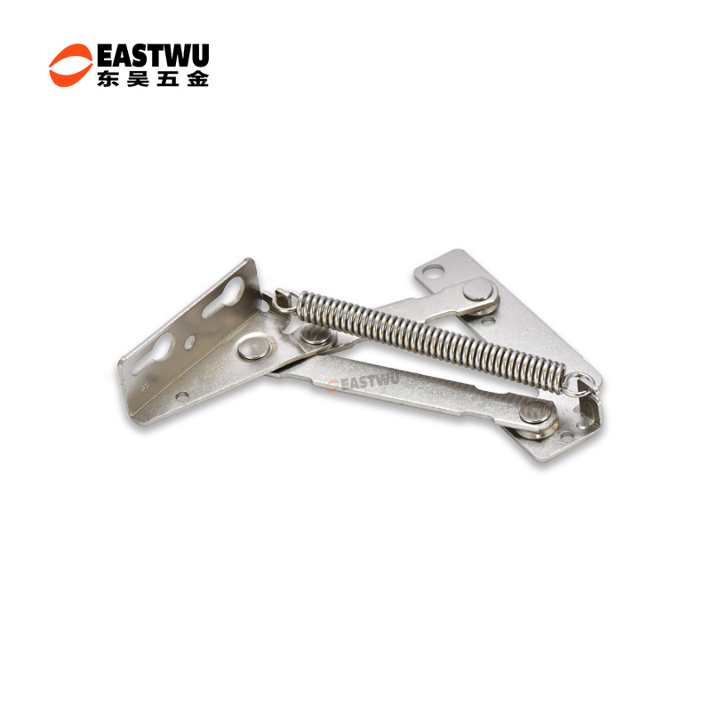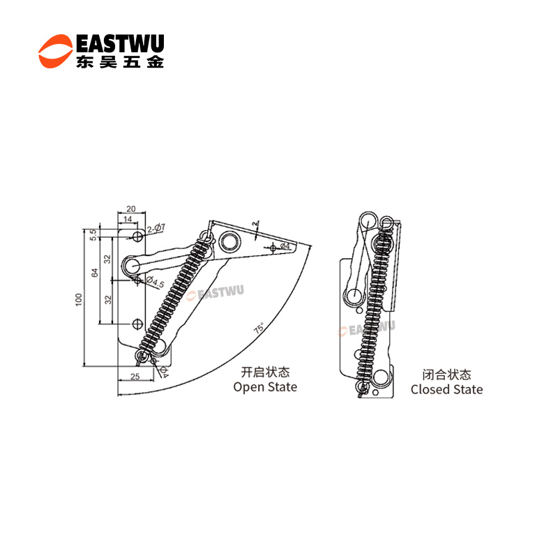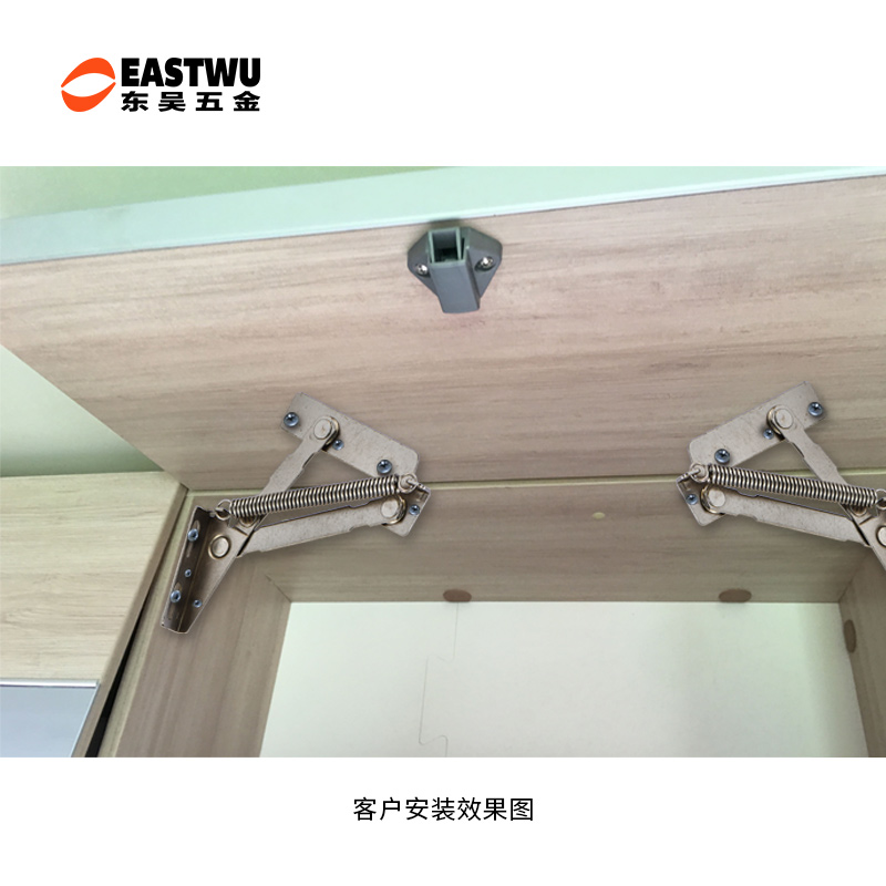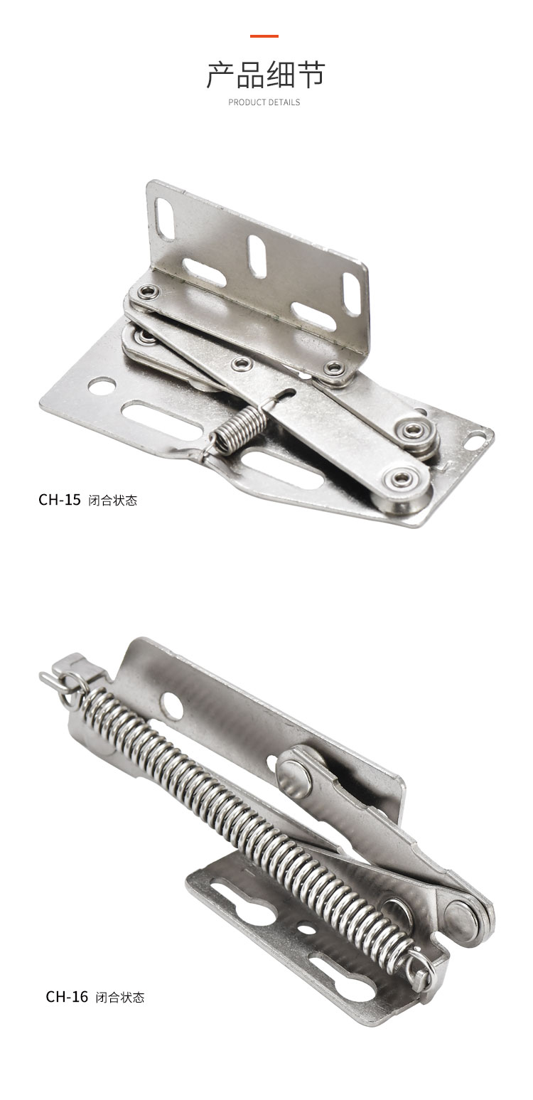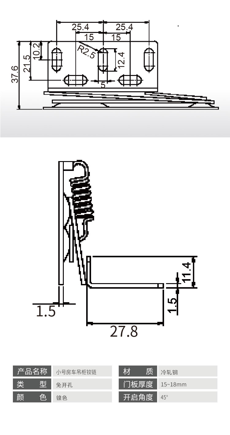 冷轧钢房车吊柜铰链 免开孔 无需加装气撑 柜门自动撑起 适用门厚15-18mm 开启角度75° 使用范围房车吊柜、衣柜等