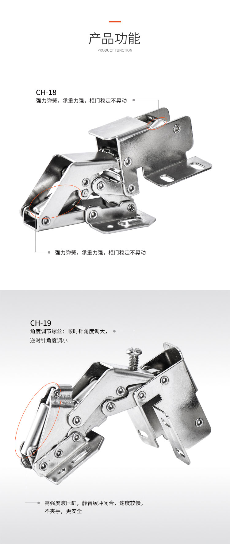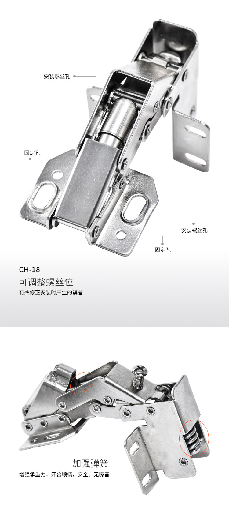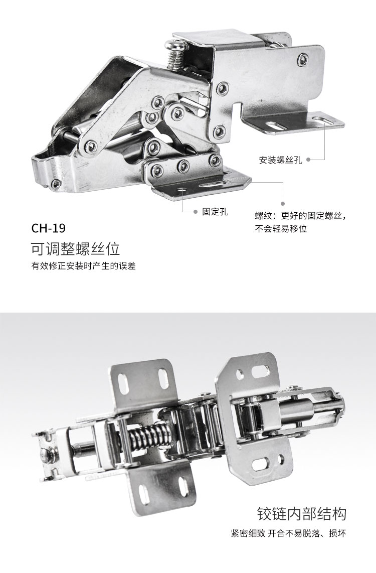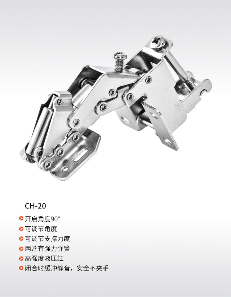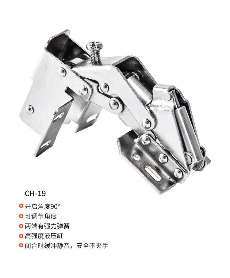 材质冷轧钢,镍色,开启角度90°,适合门厚15-18mm,适用于90°转角柜,层叠门板安装,开启L型,带调节力度和开启角度螺丝