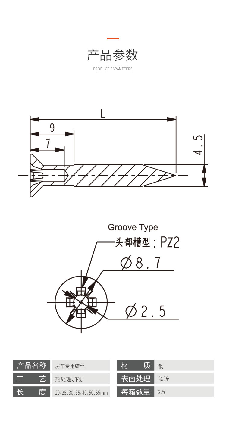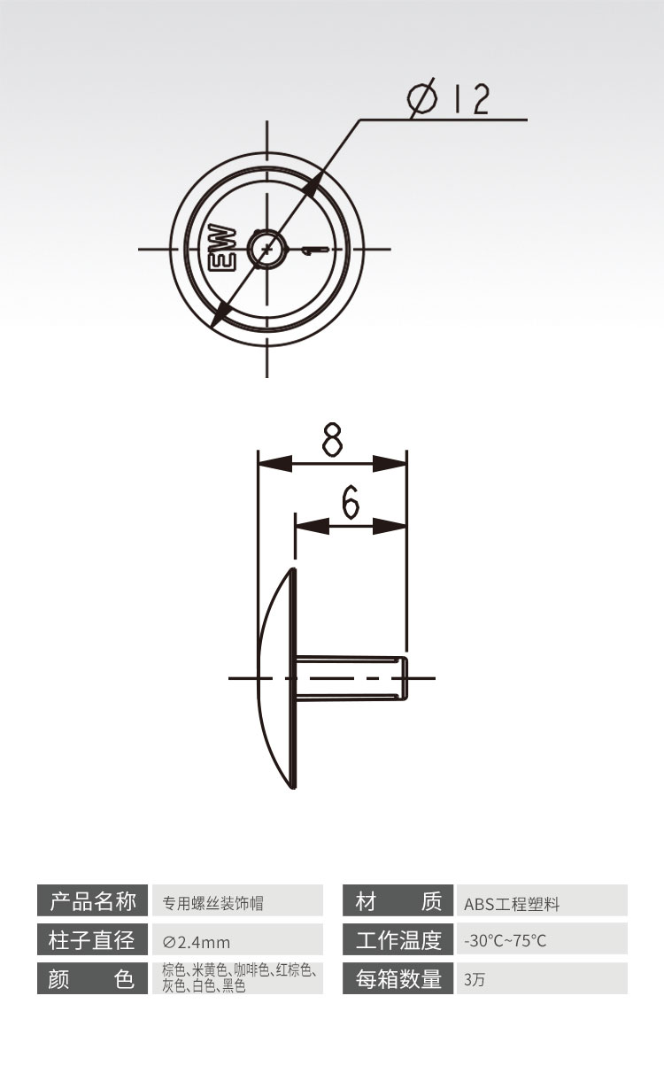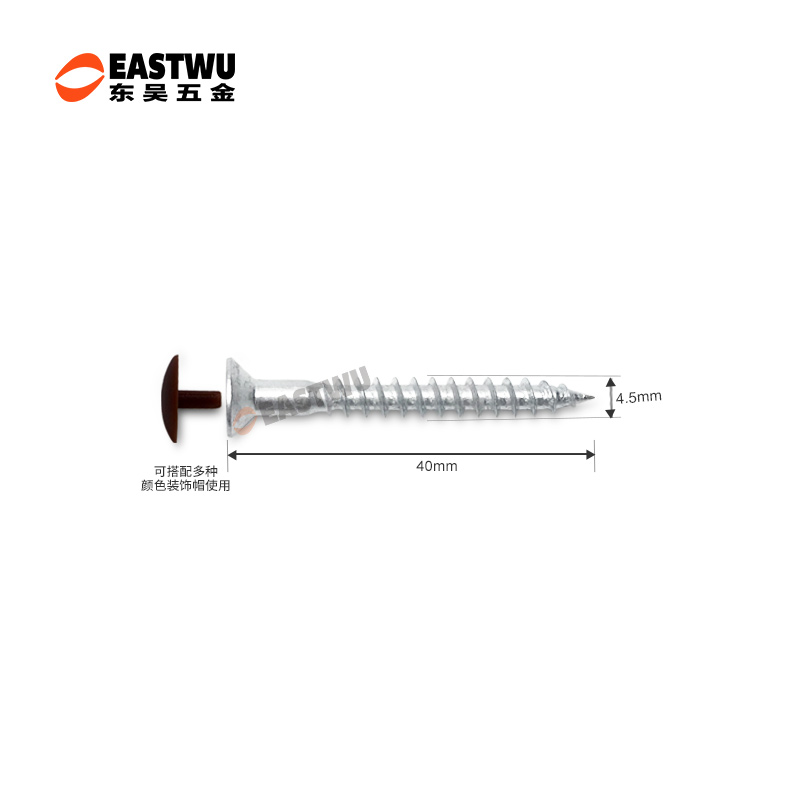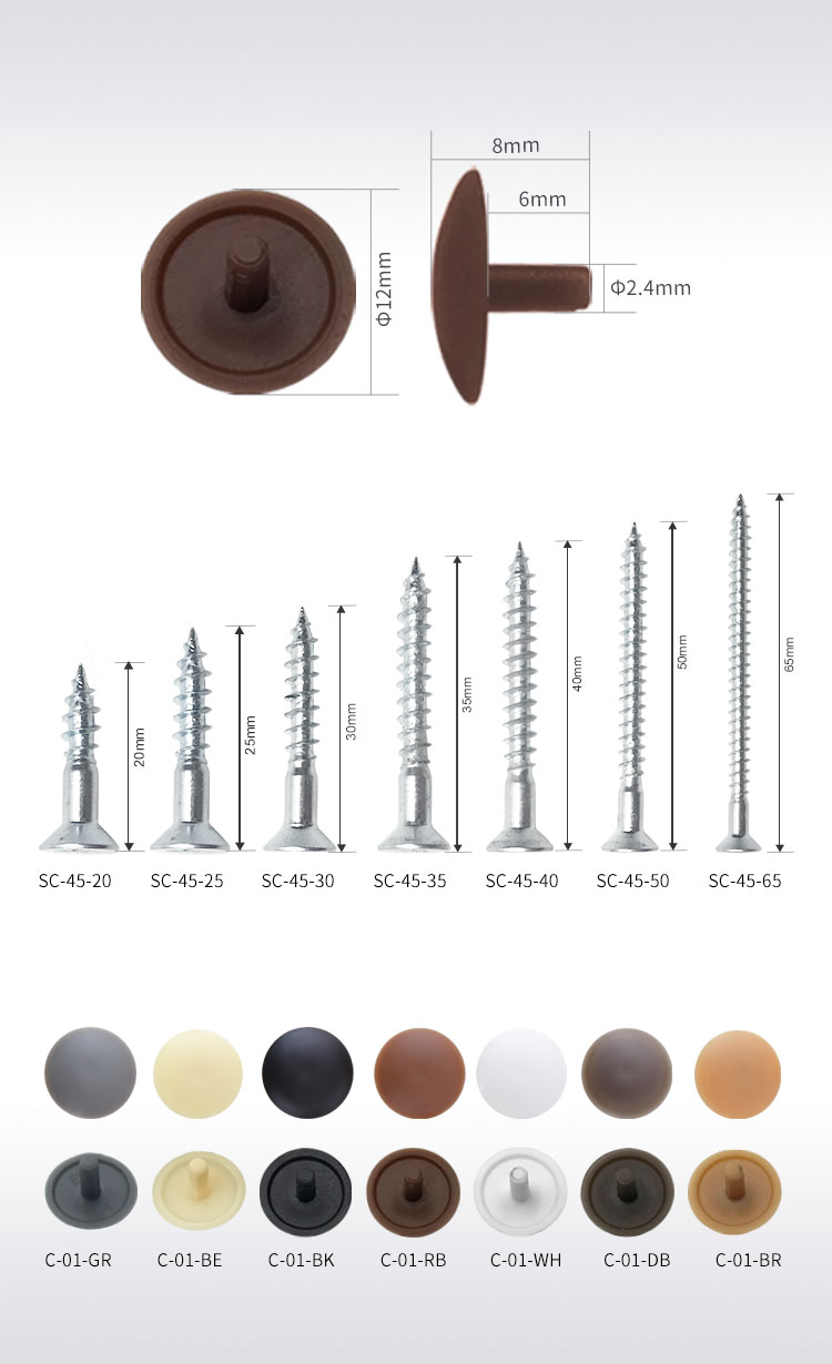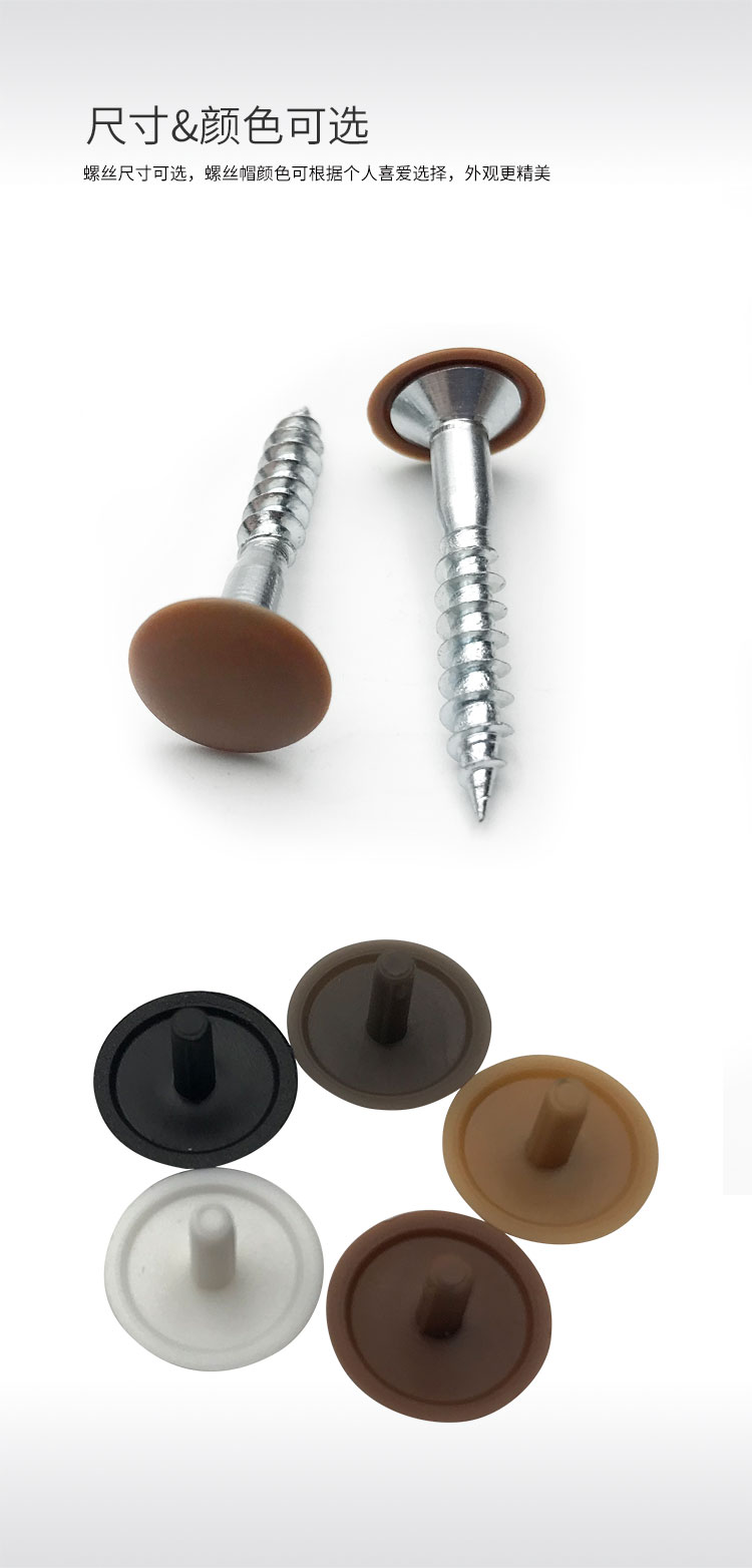 钢螺丝 带装饰帽 遮丑帽 7种尺寸可供选择; 4.5X20mm 4.5X25mm 4.5X30mm 4.5X35mm 4.5X40mm 4.5X50mm4.5X65mm 螺丝头部Φ2.5mm深7mm 螺丝可配装饰帽,多种颜色可以选择 也可根据家具板颜色定制