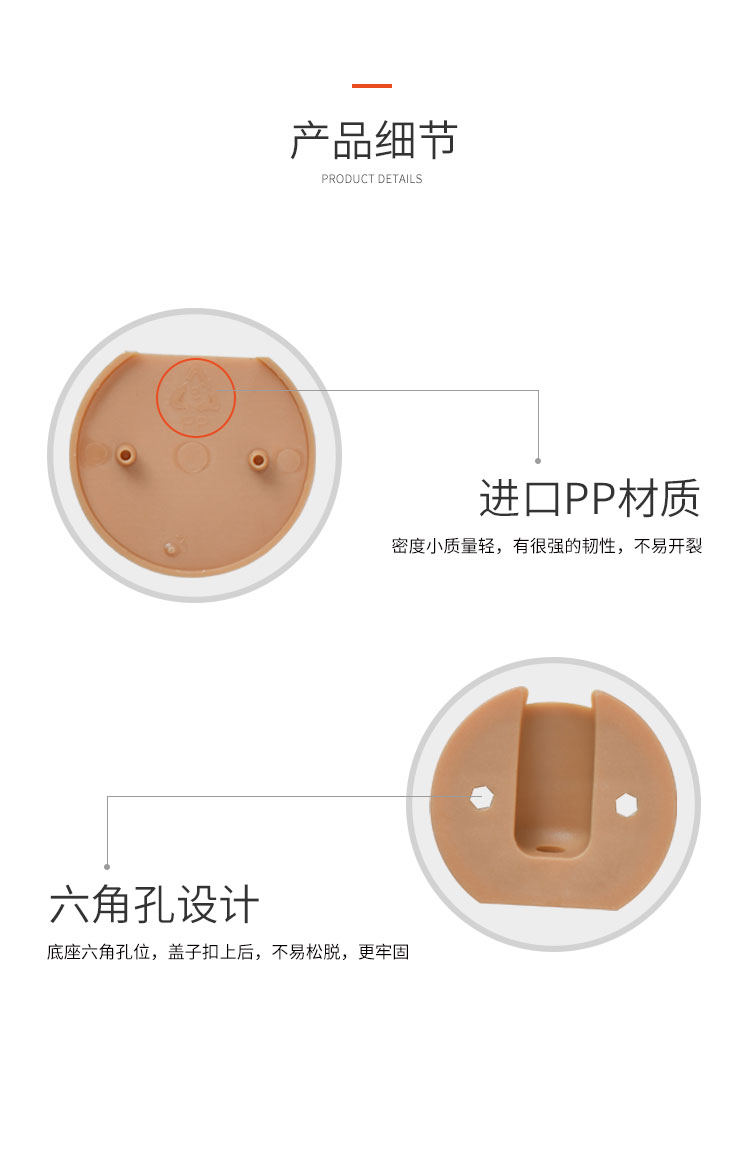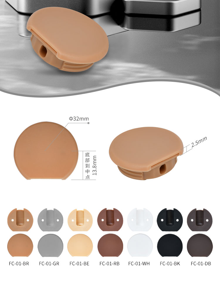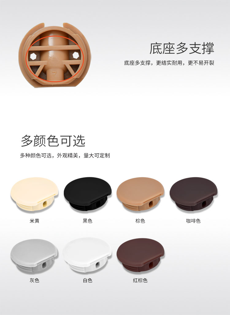 ·多色可选 可定制颜色 六边形设计 不易脱落 不开裂 ·门板厚度:12~20mm 开孔尺寸:Φ26mm 工作温度:-30C~75℃ 材质:PP 量大可定制颜色