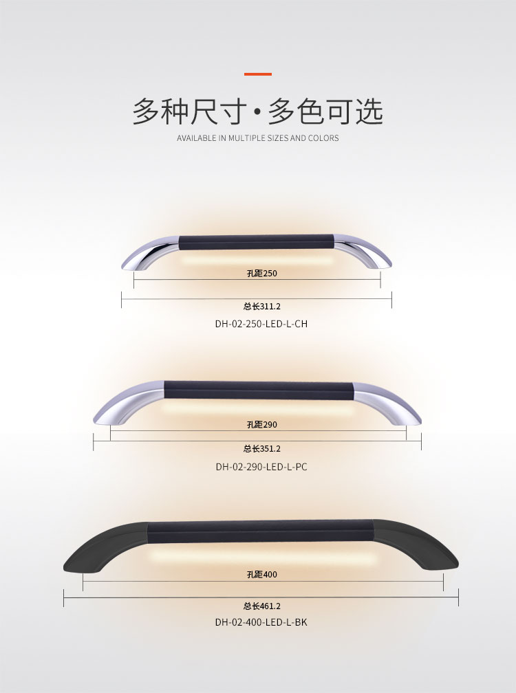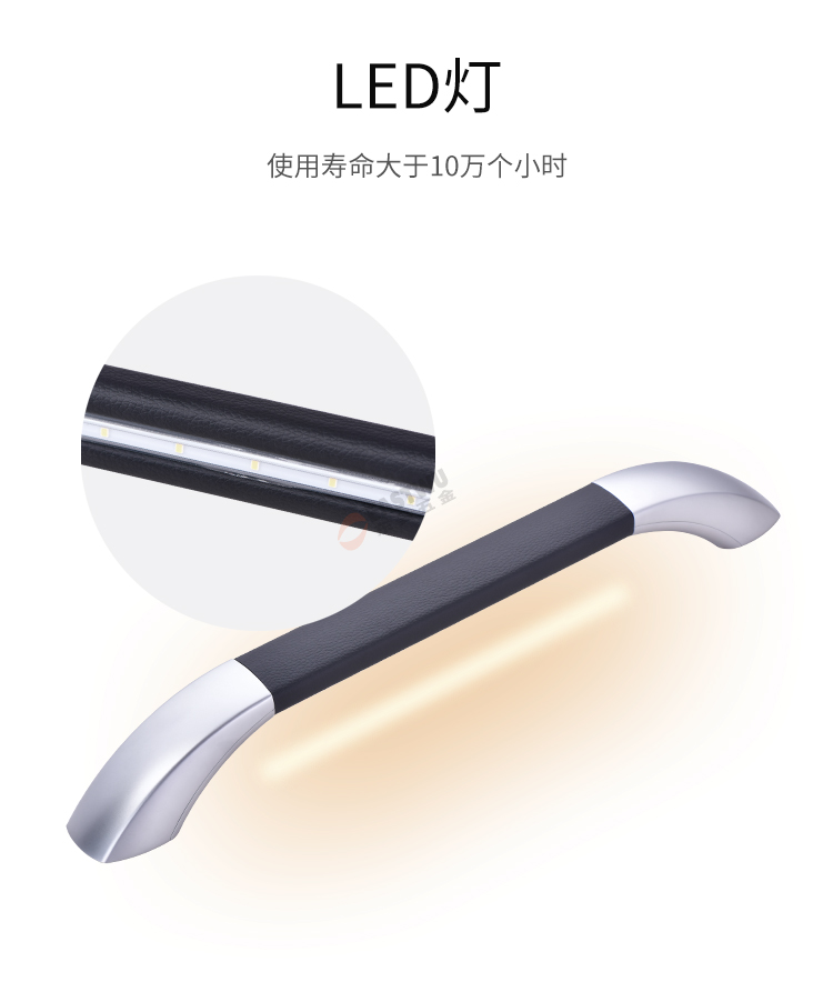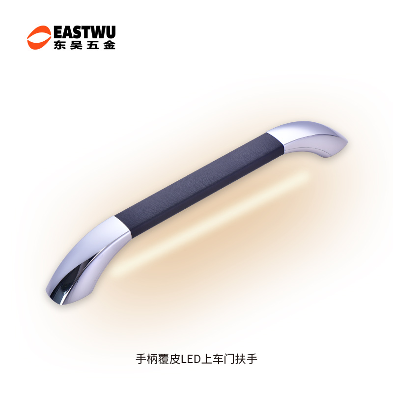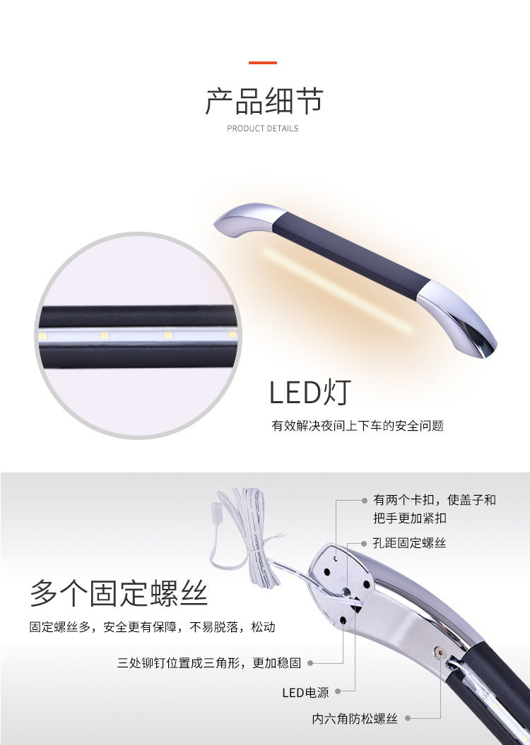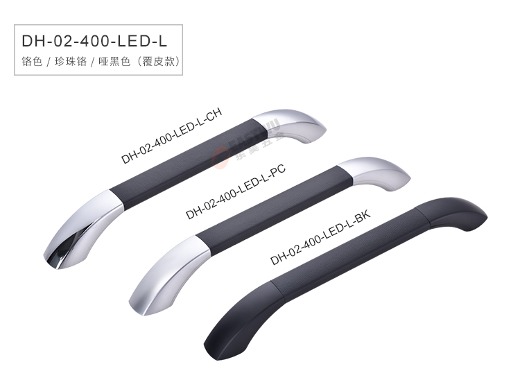 LED上车门发光扶手 锌合金&铝合金 手柄覆皮 颜色和长度可选,有铬色、珍珠铬、哑黑色,孔距250/290/400mm 长度311.2/351.2/461.2mm 适用门厚12-50mm
