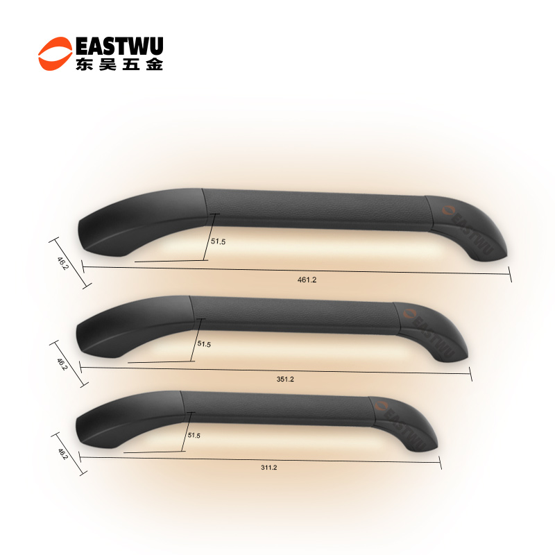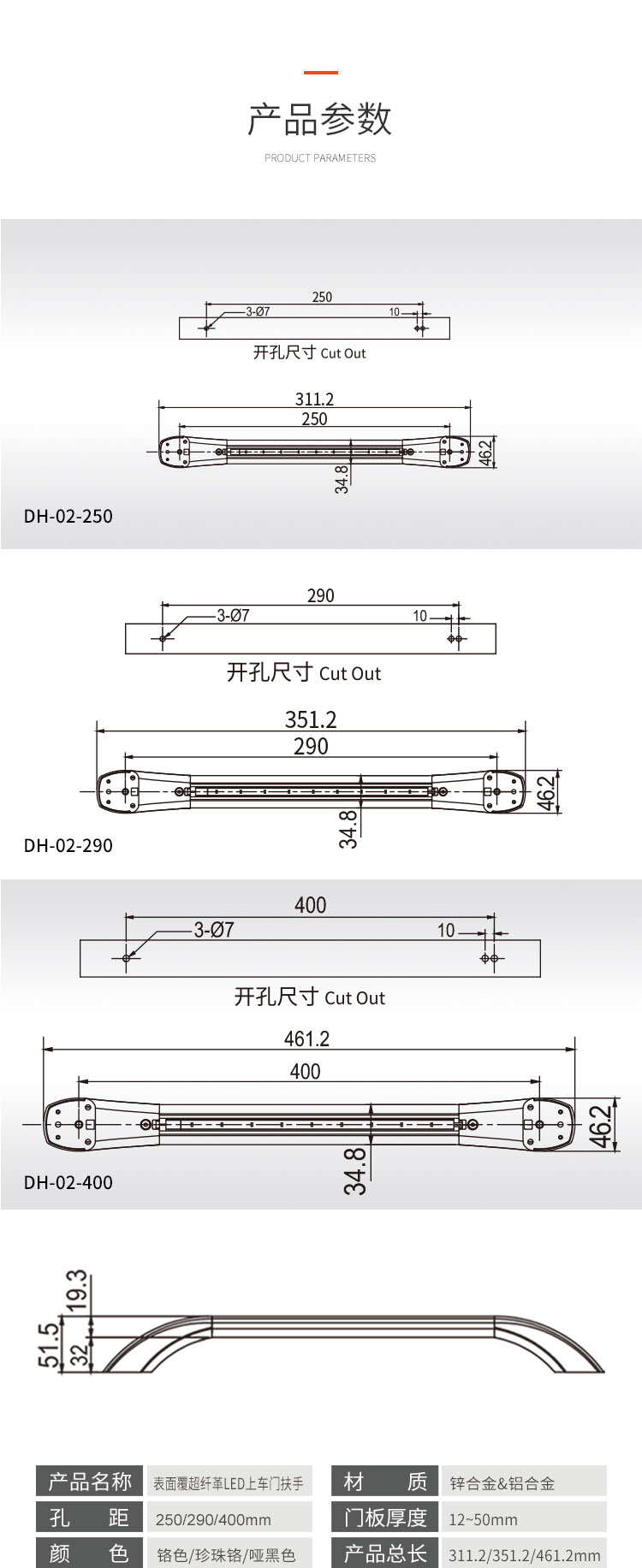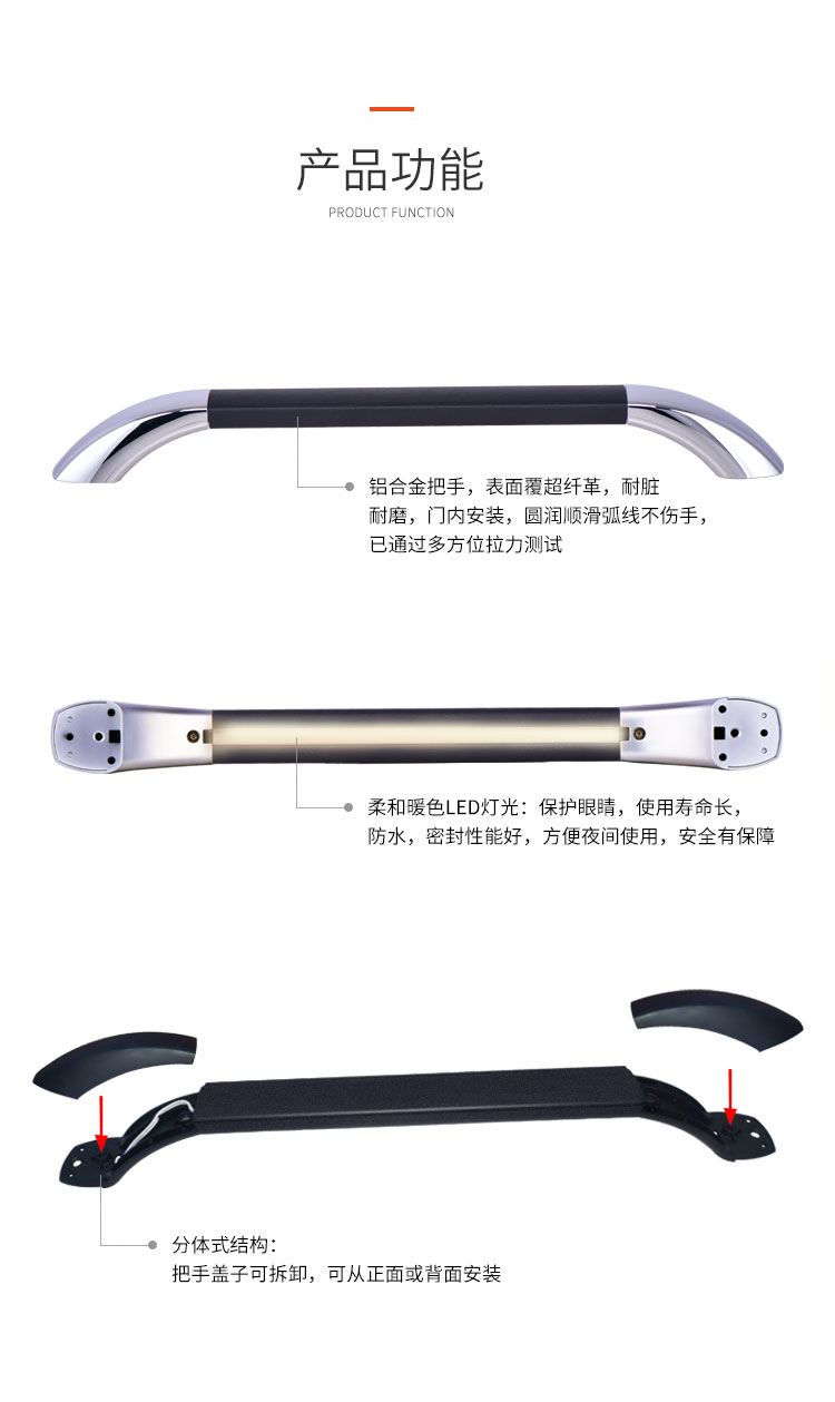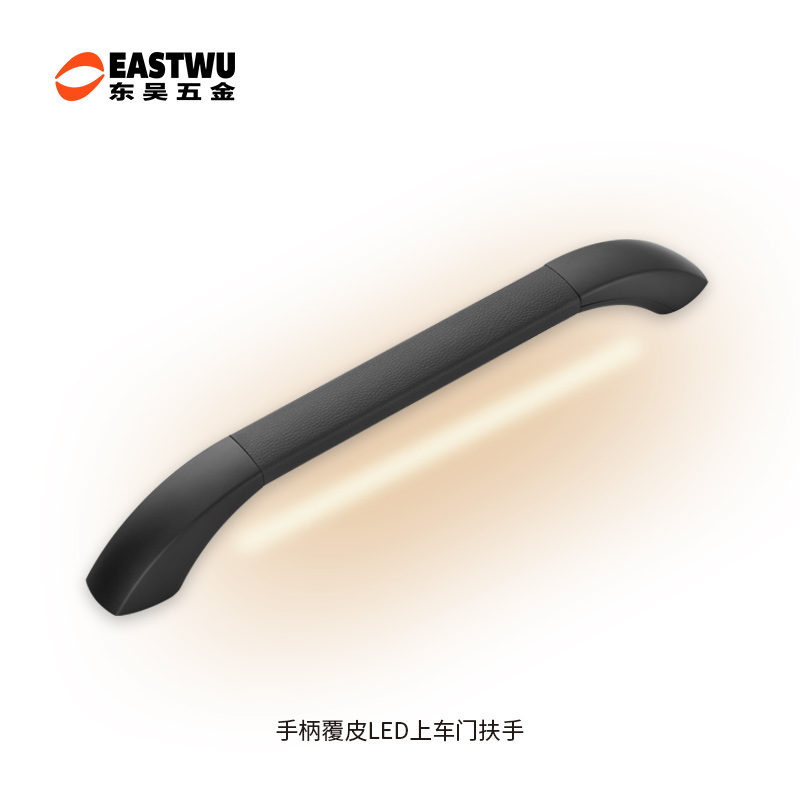 LED上车门发光扶手 锌合金&铝合金 手柄覆皮 颜色和长度可选,有铬色、珍珠铬、哑黑色,孔距250/290/400mm 长度311.2/351.2/461.2mm 适用门厚12-50mm