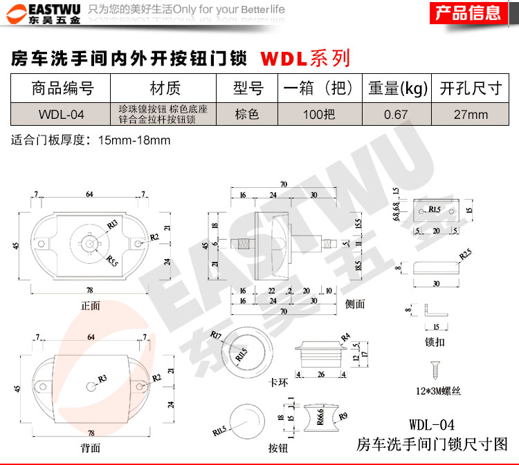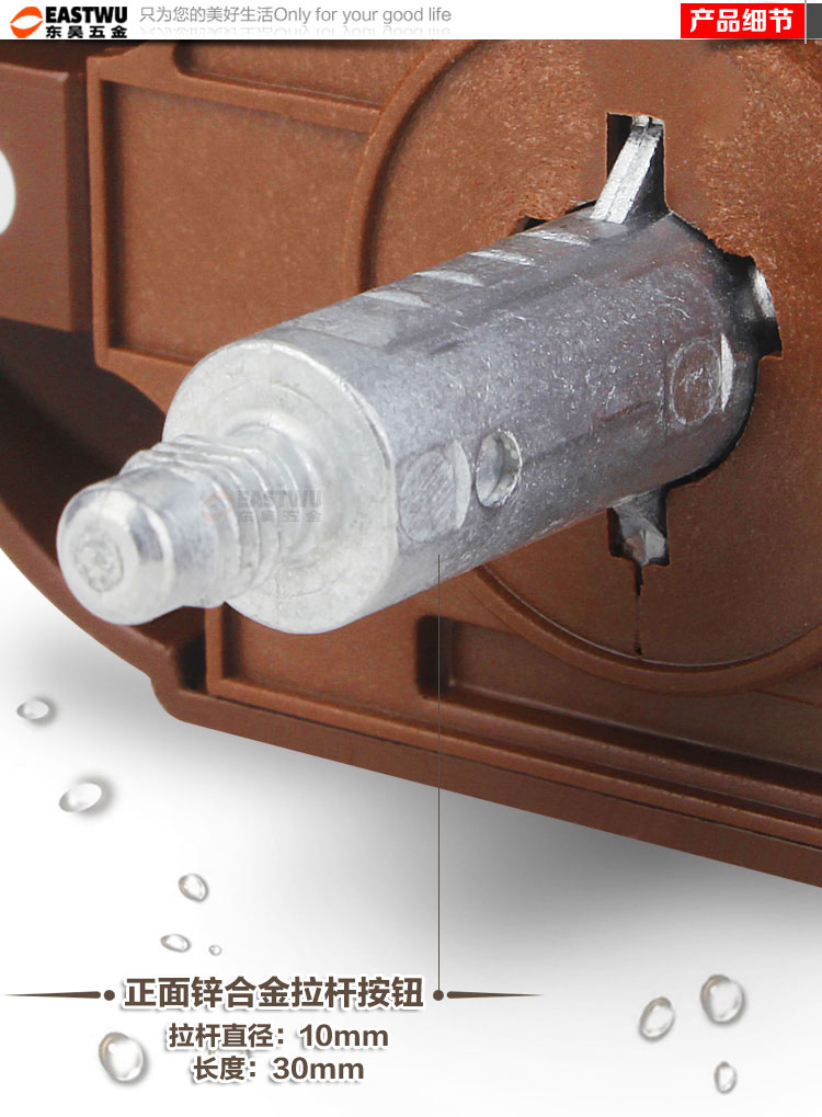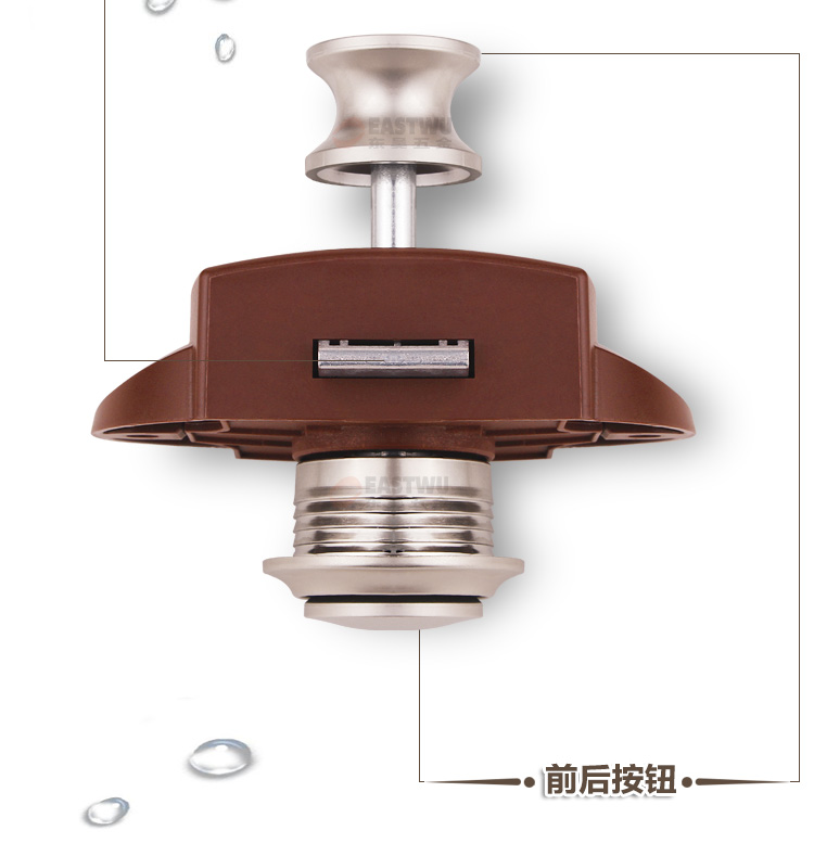 ·材质:珍珠镍按钮 棕色底座 锌合金拉杆按钮锁 适合门板厚度:15~18mm 开孔尺寸:Φ27mm