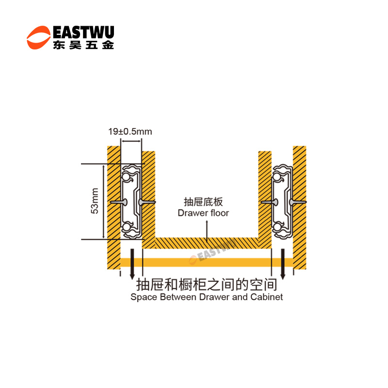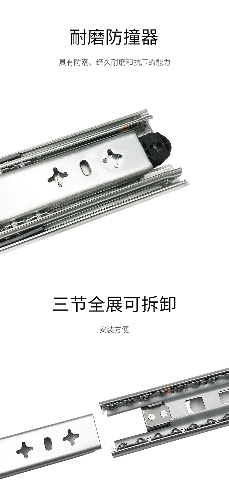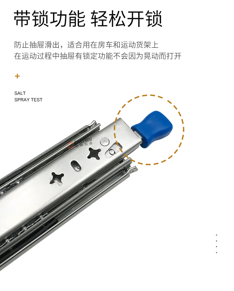 ·适用房车橱柜、工业抽屉 安装在抽屉侧面 带锁导轨 承重:120KG 长度:250-1800mm 导轨宽度:53mm 导轨厚度:19mm 材料厚度:2.0mm 使用范围:房车橱柜、工业抽屉等