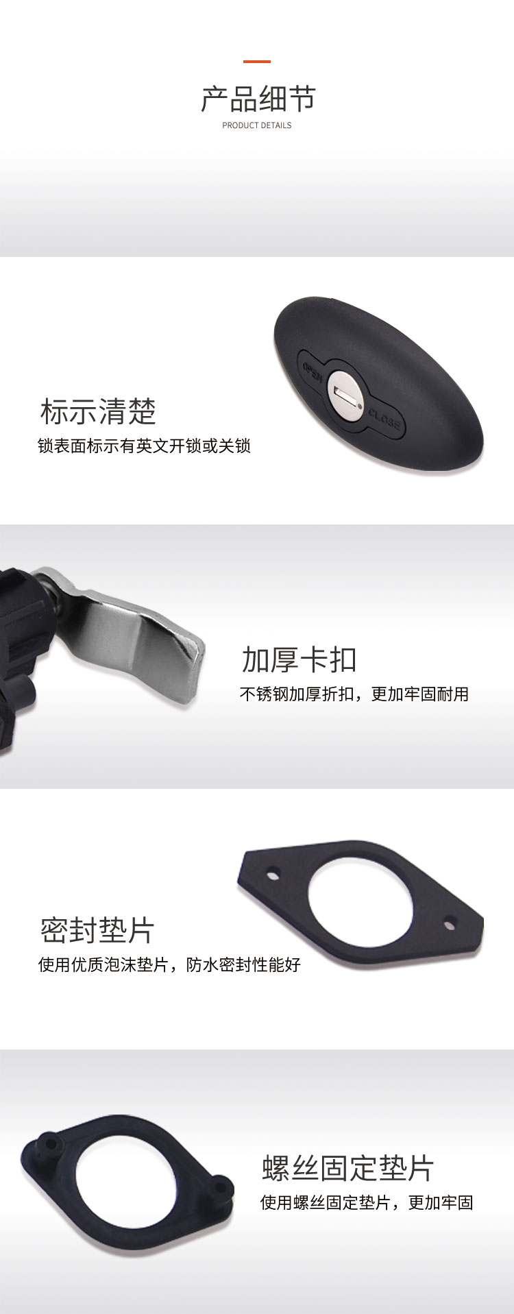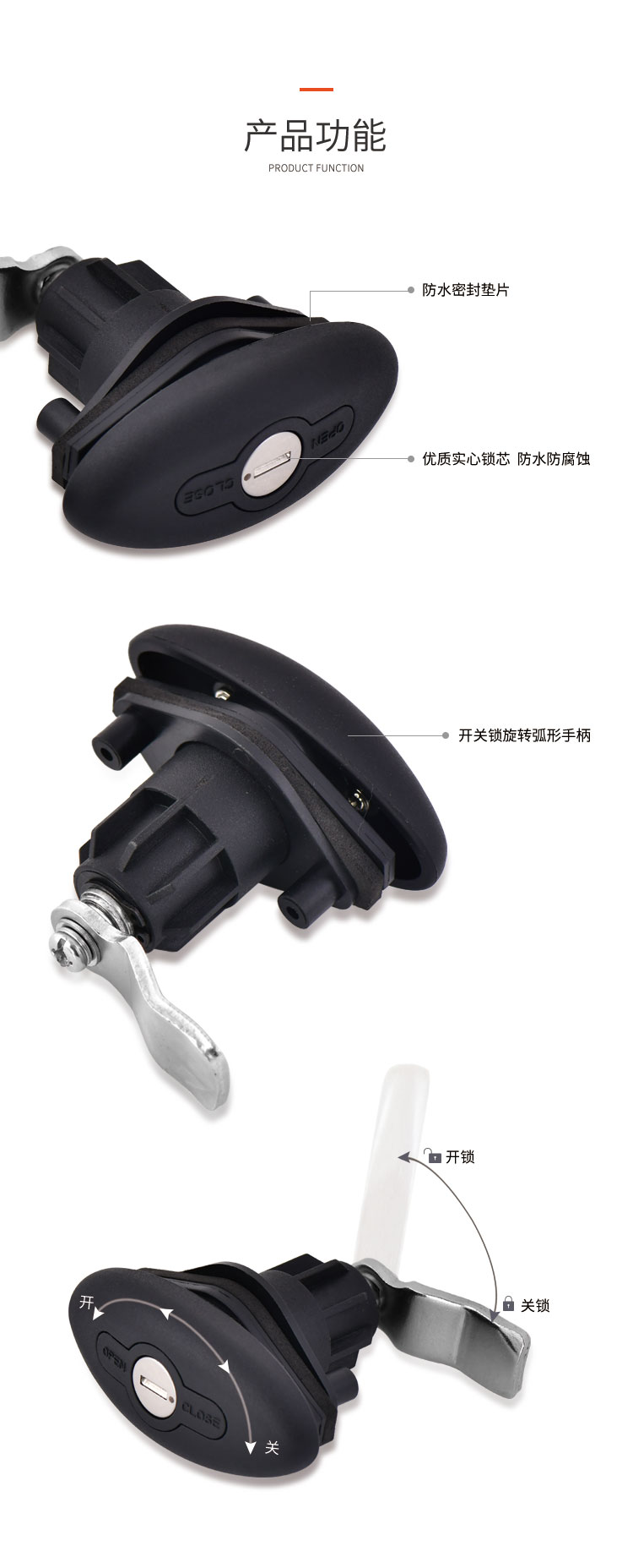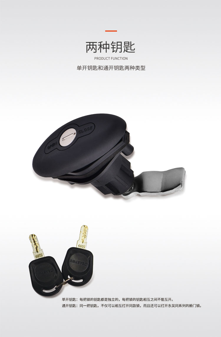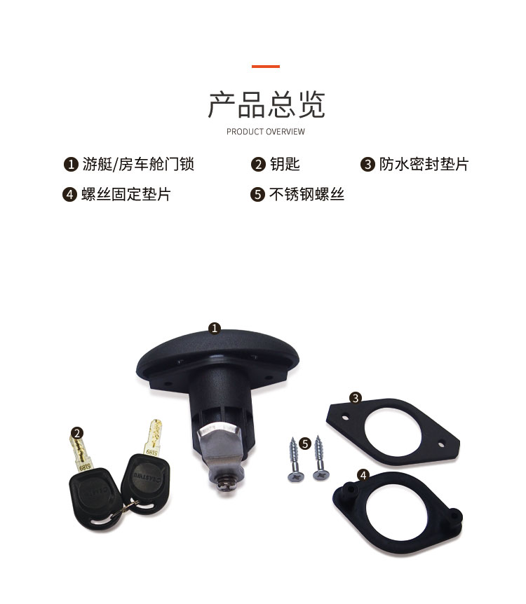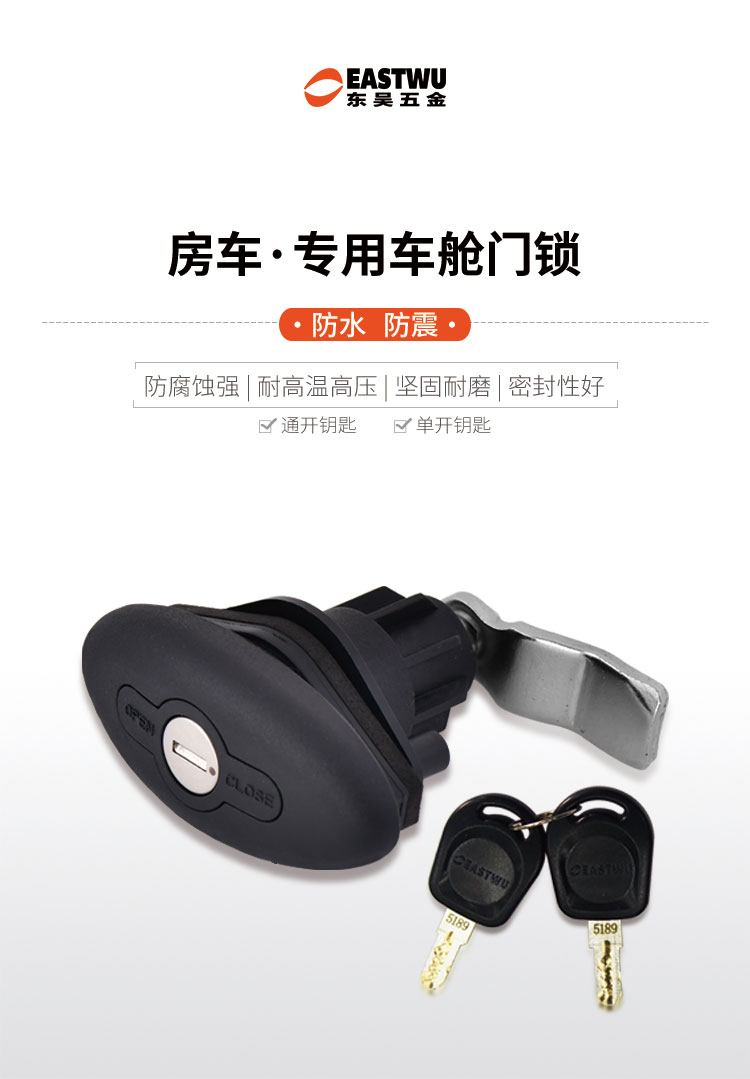 特点:可定制与房车门锁一样的钥匙,一把钥匙就可以开房车上面的所有舱门锁与门锁。开孔尺寸φ32mm 锌合金&尼龙材质 适用门厚20-35mm