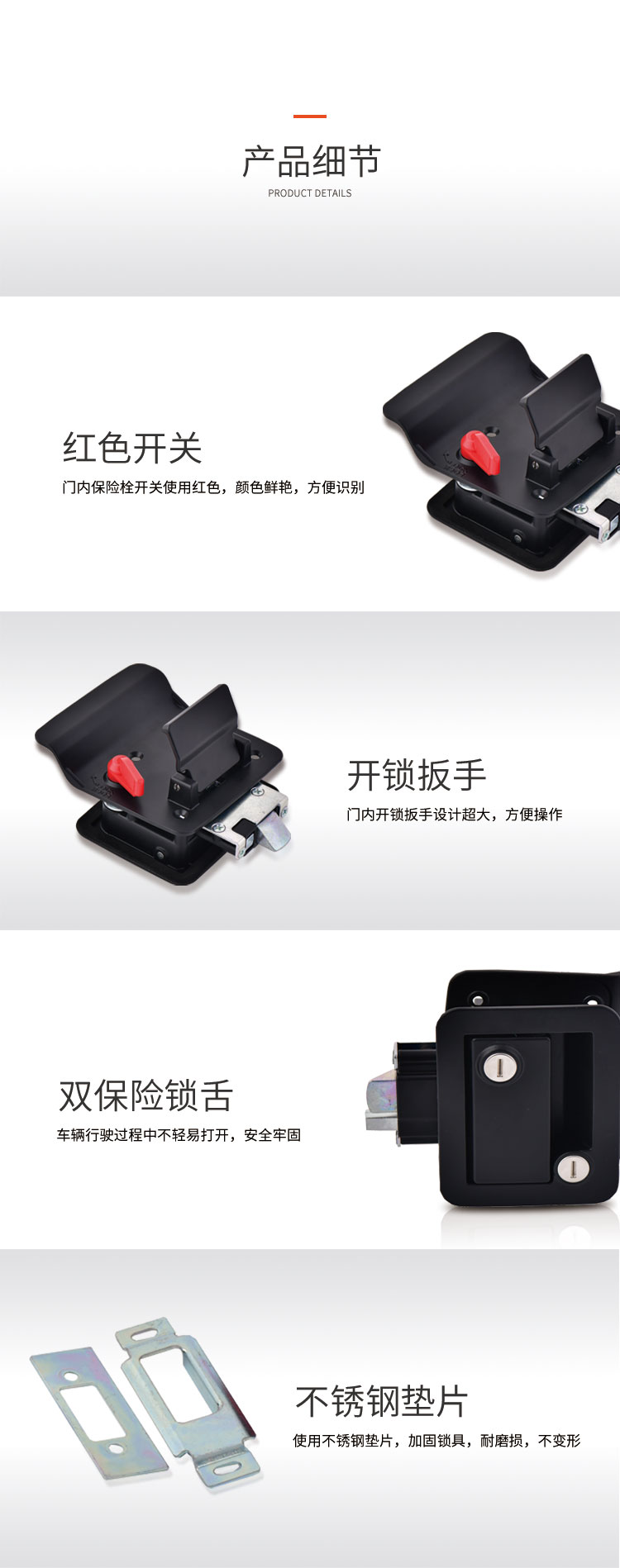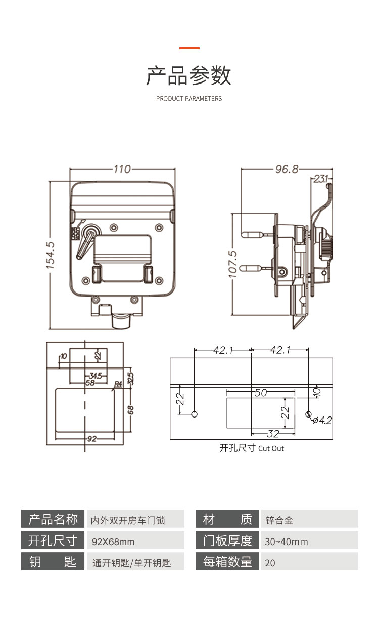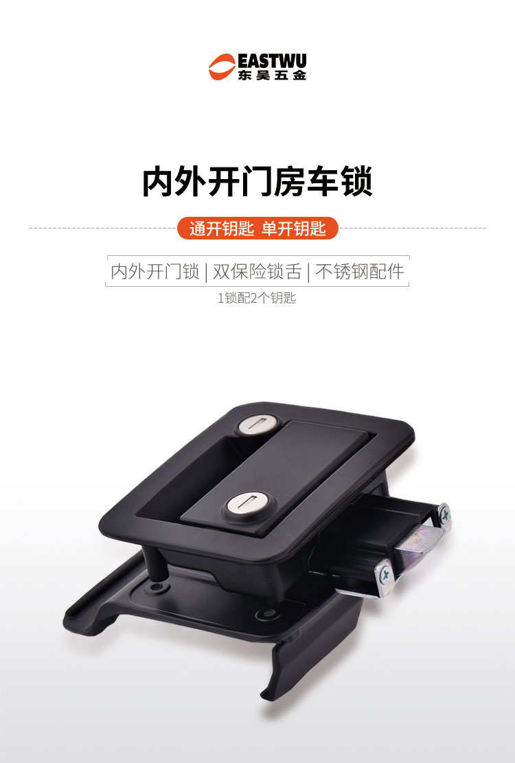 ·材质:锌合金 ·钥匙:可订购分组钥匙或与2991舱门锁通开的钥匙 ·配件:螺丝&挡片1锁配2个钥匙 ·开孔尺寸:92X68mm 两种钥匙,一种是通开钥匙,一种是单开钥匙,自由选择,结构牢固,