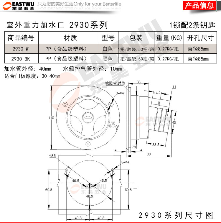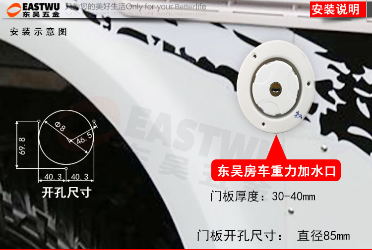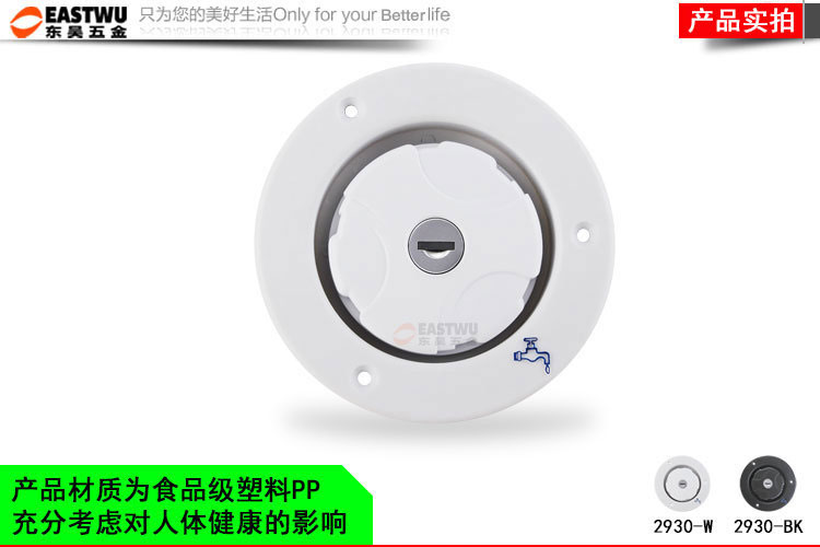 ·材质:PP(食品级塑料) 适合门板厚度:30-40mm 开孔尺寸:Φ85mm