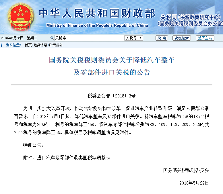 5月22日,中华人民共和国财政部发布《国务院关税税则委员会关于降低汽车整车及零部件进口关税的公告》,公告表明自7月1日起,汽车整车税率为25%和20%的将降至15%,以下为公告全文: